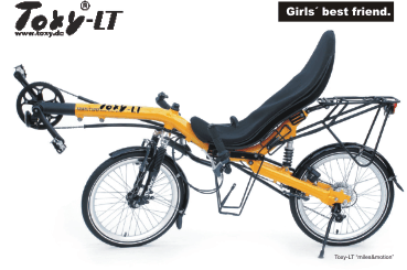According to a review in the magzine “Radwelt” issued by ADFC (the German Bicycle Club) the Toxy LT is the only true recumbent for small people. With the small frame and the low seating position is easier to comfortably mount and dismount the bike and keep it safely upright when not in motion.